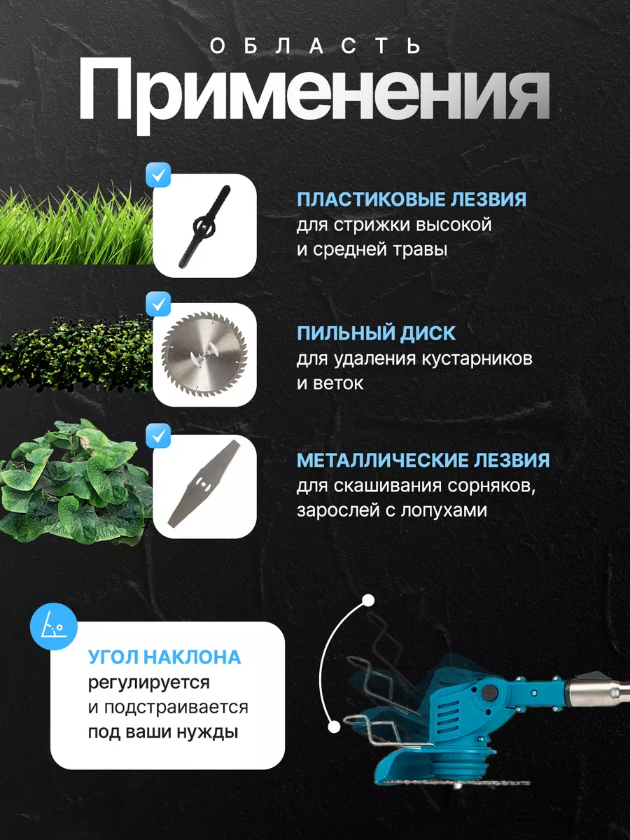 Представляем вашему вниманию инновационный аккумуляторный триммер для травы, созданный для легкости и эффективности в уходе за садом. Этот мощный инструмент идеально подходит для стрижки травы, обрезки кустарников, а также удаления и прополки сорняков в зависимости от выбранной насадки, обеспечивая профессиональные результаты без лишних усилий.